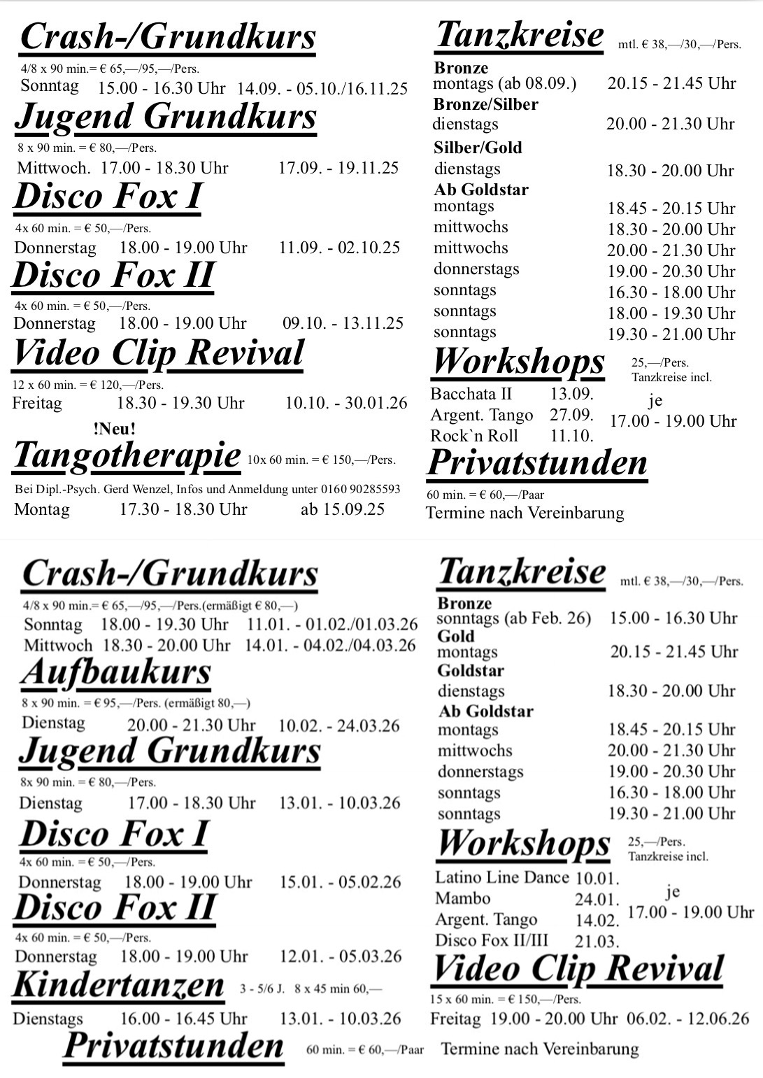 Hierzu gehören Kurse für Paare/Singles/Jugendliche, die mit einem Grundkurs starten. Hier werden die Grundschritte für Standard- und Lateintänze gezeigt (Discofox, Foxtrott, Blues, Langsamer Walzer, Wiener Walzer, Tango, Rumba, ChaChaCha, Jive).